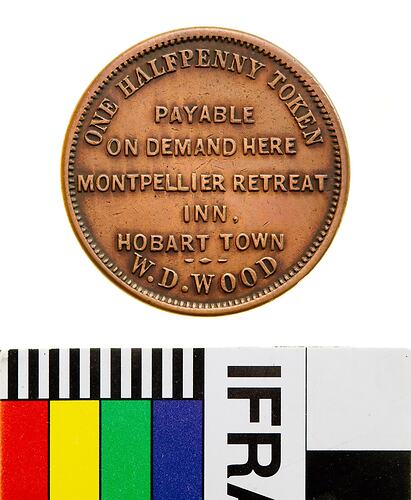Obverse: ONE HALFPENNY TOKEN PAYABLE ON DEMAND HERE MONTPELLIER RETREAT INN HOBART TOWN W.D. WOOD Reverse: MONTPELLIER RETREAT INN W.D. WOOD