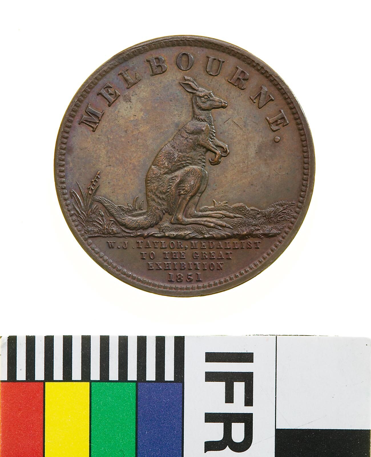 Kangaroo seated on tail in grassy field facing right, around above, MELBOURNE; in exergue in four lines W.J. TAYLOR MEDALLIST TO THE GREAT EXHIBITION 1851