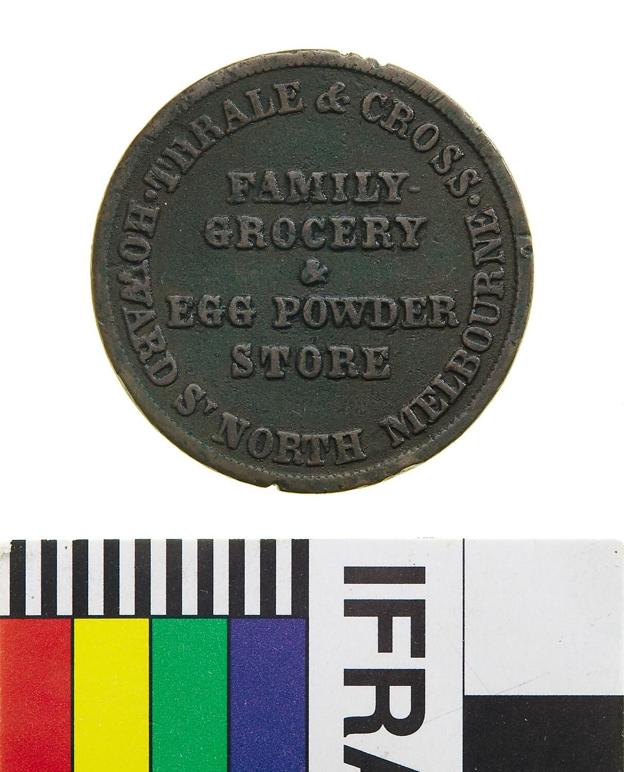Obverse: THRALE & CROSS FAMILY GROCER & EGG POWDER STORE HOWARD ST. NORTH MELBOURNE Reverse: AUSTRALIA