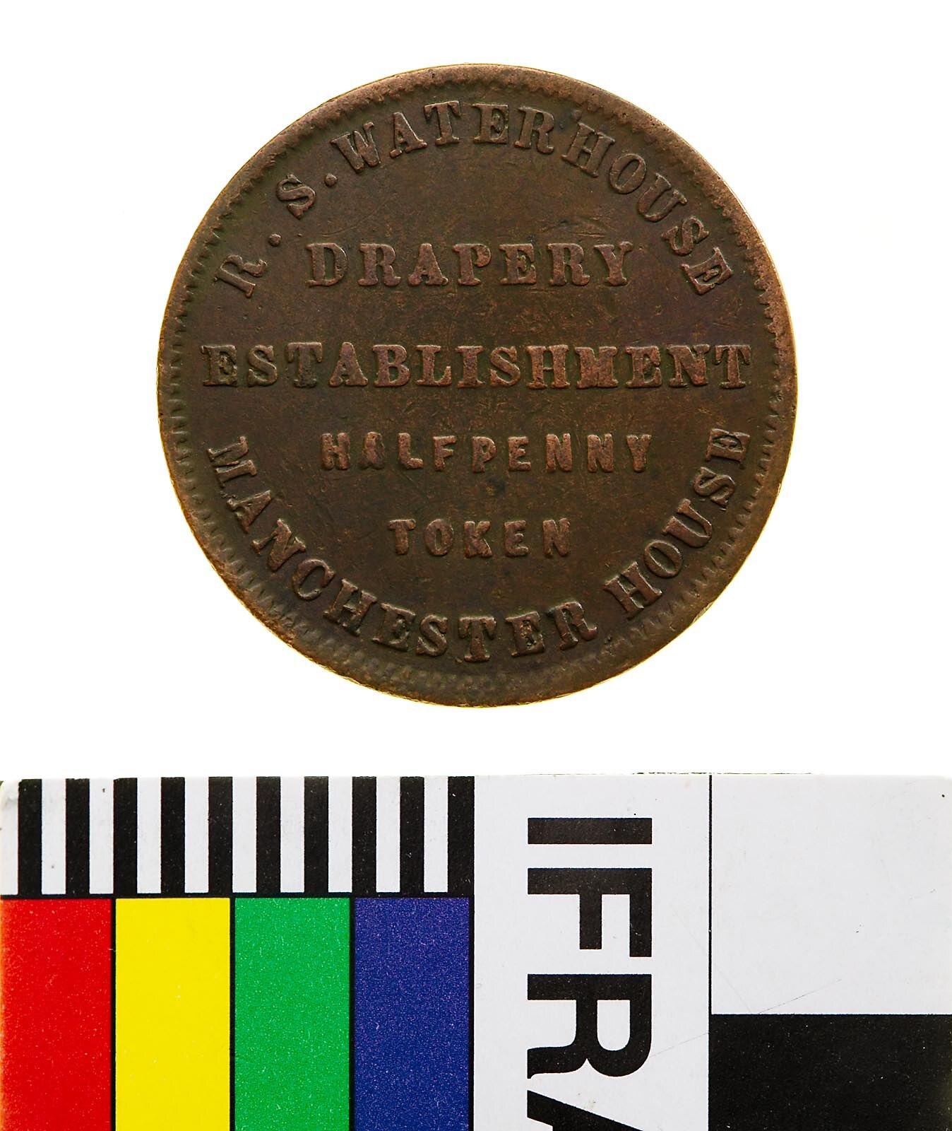 Obverse: R.S.WATERHOUSE DRAPERY ESTABLISHMENT HOBART TOWN HALFPENNY TOKEN MANCHESTER HOUSE Reverse: FOR READY MONEY THE SPIRIT OF TRADE BABY LINEN WAREHOUSE