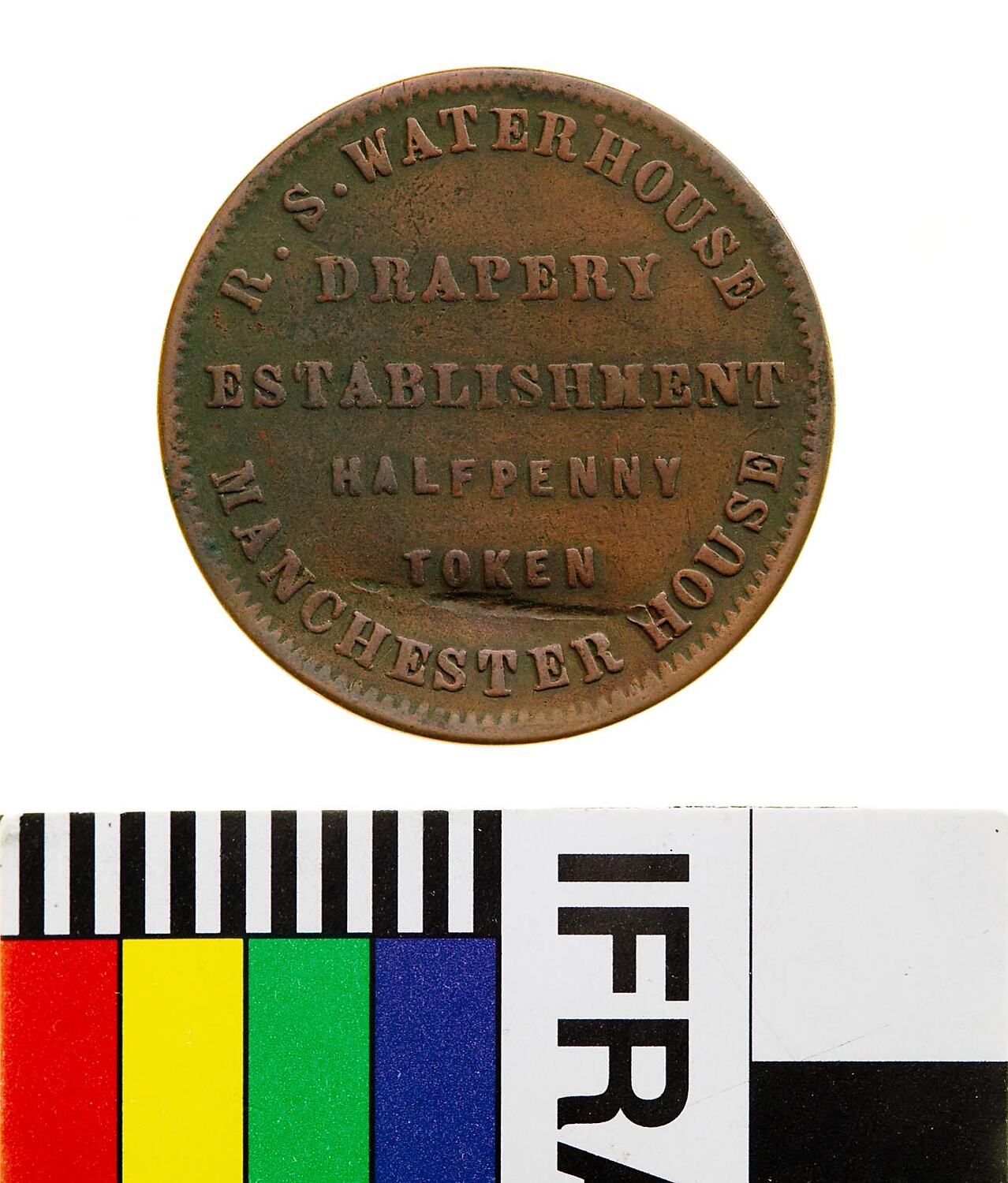 A round copper token (27 mm diameter) featuring the name, address and business of the company which issued the tokens: R.S. Waterhouse, Manchester House, Hobart Town drapery establishment. The reverse of the token depicts a child suspended from a walking trainer. Has been cleaned and has a heavy knock to obverse below TOKEN.