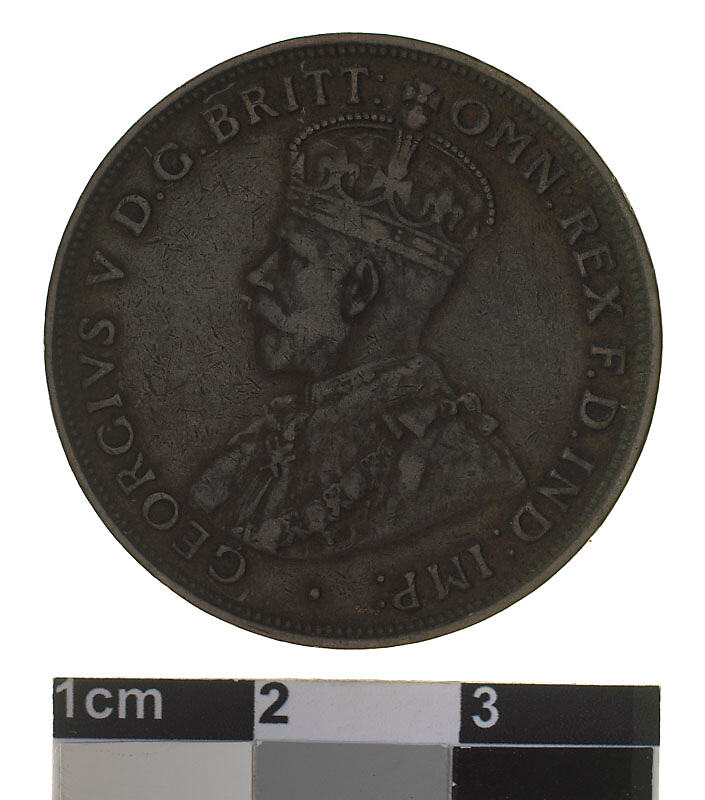 A bronze coin (30.8 mm diameter with plain edge) featuring a crowned and robed bust of George V facing left; around, GEORGIVS V D.G: BRITT: OMN: REX F.D. IND: IMP: ; below bust in small lettering the artist's initials B.M. The reverse features, within a circle of beads, the words ONE PENNY in two lines between upper and lower ornate scrolls; around the circle of beads, COMMONWEALTH OF AUSTRALIA . 1922 .