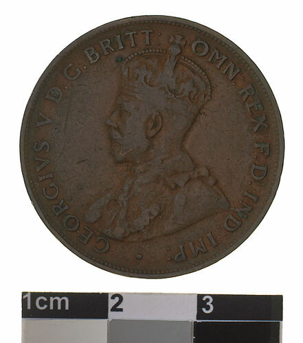 A bronze coin (30.8 mm diameter with plain edge) featuring a crowned and robed bust of George V facing left; around, GEORGIVS V D.G: BRITT: OMN: REX F.D. IND: IMP: ; below bust in small lettering the artist's initials B.M. The reverse features, within a circle of beads, the words ONE PENNY in two lines between upper and lower ornate scrolls; around the circle of beads, COMMONWEALTH OF AUSTRALIA . 1921 .
