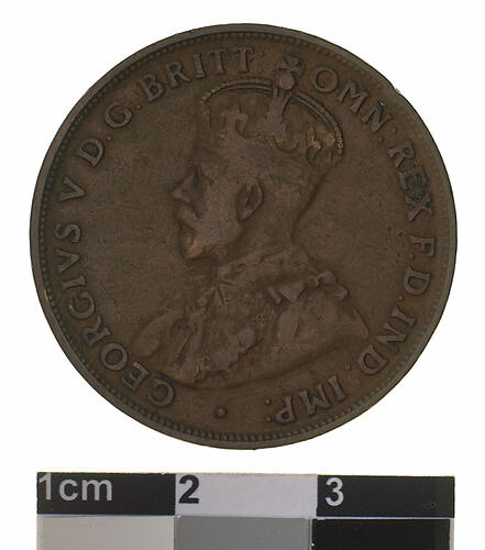 A bronze coin (30.8 mm diameter with plain edge) featuring a crowned and robed bust of George V facing left; around, GEORGIVS V D.G: BRITT: OMN: REX F.D. IND: IMP: ; below bust in small lettering the artist's initials B.M. The reverse features, within a circle of beads, the words ONE PENNY in two lines between upper and lower ornate scrolls (there is a small dot above the top scroll); around the circle of beads, COMMONWEALTH OF AUSTRALIA . 1920 .