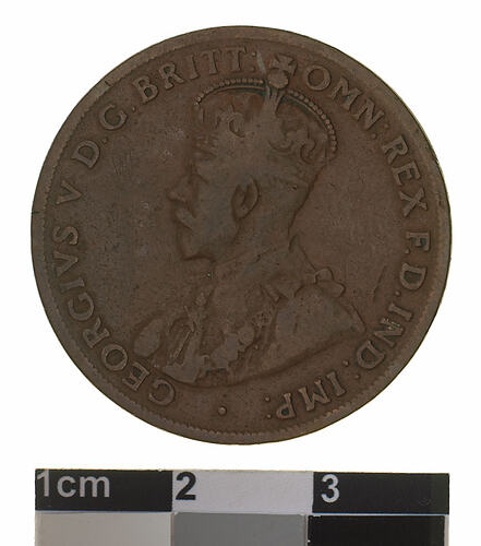 A bronze coin (30.8 mm diameter with plain edge) featuring a crowned and robed bust of George V facing left; around, GEORGIVS V D.G: BRITT: OMN: REX F.D. IND: IMP: ; below bust in small lettering the artist's initials B.M. The reverse features, within a circle of beads, the words ONE PENNY in two lines between upper and lower ornate scrolls (there is a small dot above the lower scroll); around the circle of beads, COMMONWEALTH OF AUSTRALIA . 1920 .