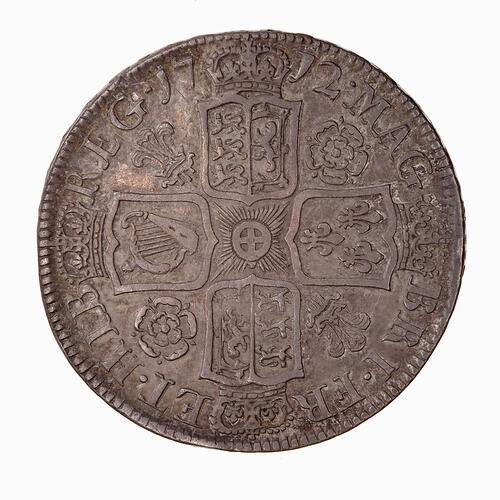 Crowned shields - with the joint arms of England and Scotland at top and bottom, Ireland at left and France at right forming a cross shape with the badge of the Star of the Garter at the centre; around, MAG BRI FR ET HIB REG 1712, the date being divided by the crown above the top joint arms of England and Scotland.