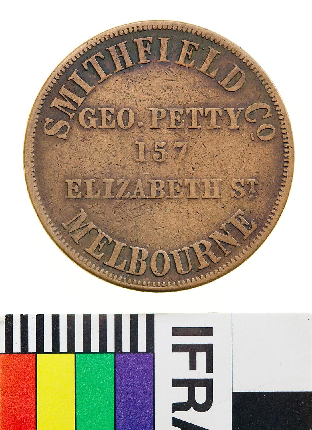 Obverse: SMITHFIELD & Co. GEO. PETTY 157 ELIZABETH ST MELBOURNE Reverse: VICTORIA (W.J.TAYLOR LONDON worn off exergue line)
