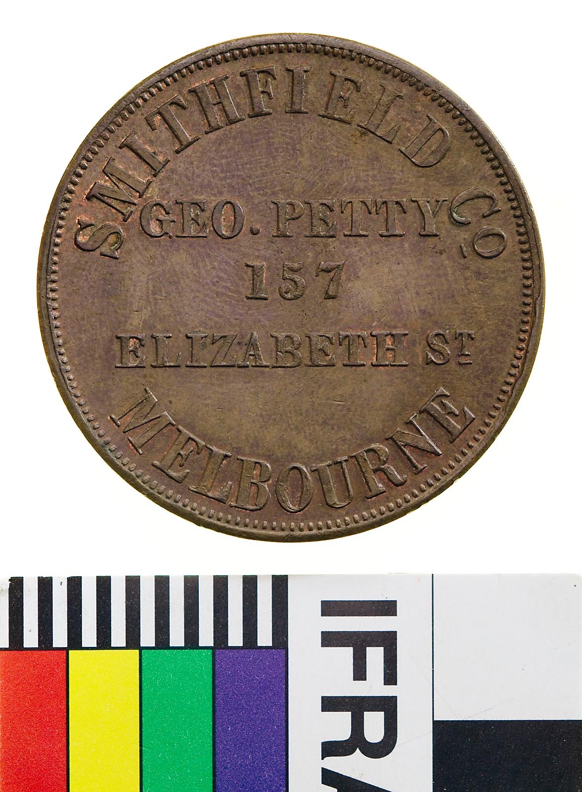Obverse: SMITHFIELD & Co. GEO. PETTY 157 ELIZABETH ST MELBOURNE Reverse: VICTORIA W.J.TAYLOR LONDON
