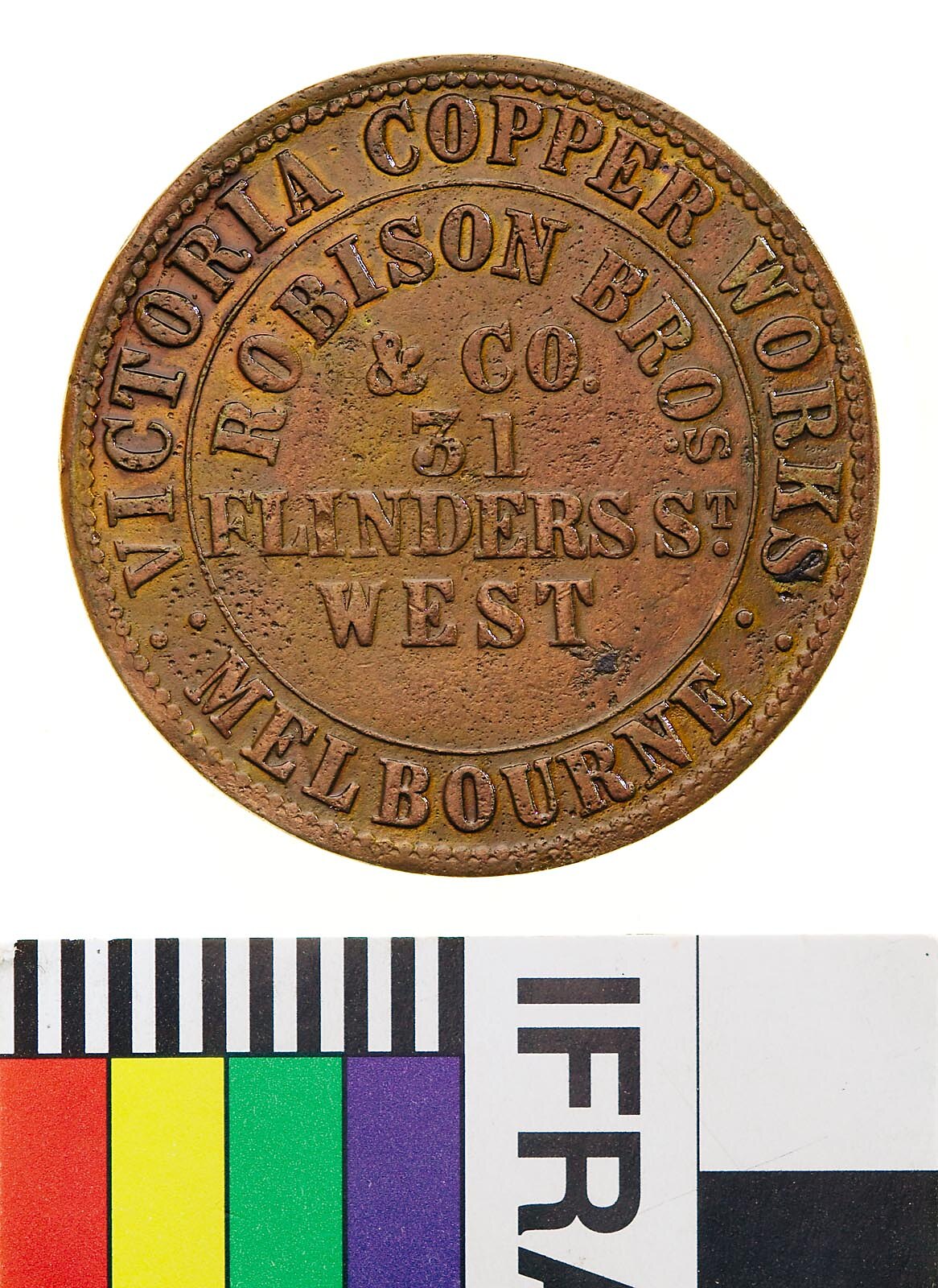 At centre within line circle, ROBISON BROS. / & CO. / 31 / FLINDERS ST. / WEST; around, VICTORIA COPPER WORKS : MELBOURNE : (Sharples' obverse A)