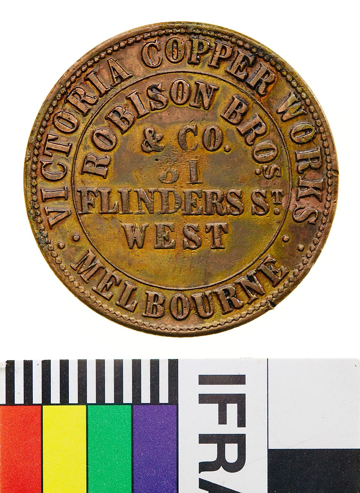 At centre within line circle, ROBISON BROS. / & CO. / 31 / FLINDERS ST. / WEST; around, VICTORIA COPPER WORKS : MELBOURNE : (Sharples' obverse A)