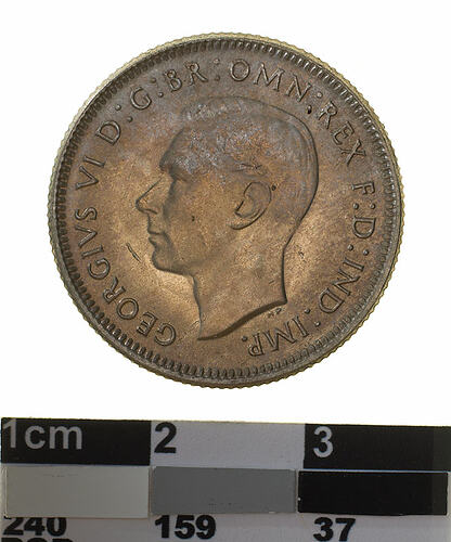 A silver coin (23.5 mm diameter with milled edge) featuring a bare head of George VI facing left; around, GEORGIVS VI D: G: BR: OMN: REX F. D. IND: IMP: ; below bust in small lettering the artist's initials H.P.. The reverse features a ram's head facing three-quarters left; around above, AUSTRALIA, around below between two Federation stars, SHILLING . 1946. The artist's initials, KG is in the field above the star on the right.