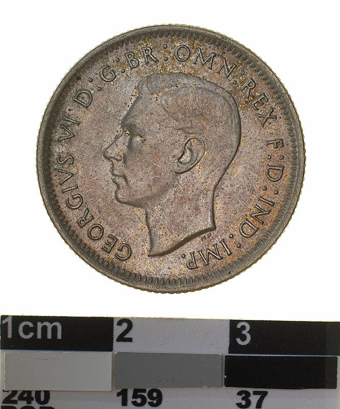 A silver coin (23.5 mm diameter with milled edge) featuring a bare head of George VI facing left; around, GEORGIVS VI D: G: BR: OMN: REX F. D. IND: IMP: ; below bust in small lettering the artist's initials H.P.. The reverse features a ram's head facing three-quarters left; around above, AUSTRALIA, around below between two Federation stars, SHILLING . 1948. The artist's initials, KG is in the field above the star on the right.