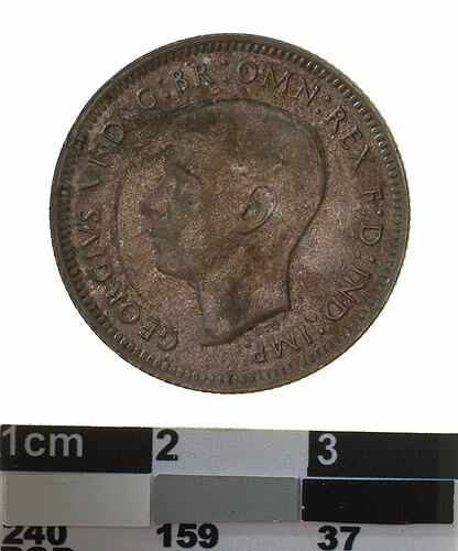 A silver coin (23.5 mm diameter with milled edge) featuring a bare head of George VI facing left; around, GEORGIVS VI D: G: BR: OMN: REX F. D. IND: IMP: ; below bust in small lettering the artist's initials H.P.. The reverse features a ram's head facing three-quarters left; around above, AUSTRALIA, around below between two Federation stars, SHILLING . 1948. The artist's initials, KG is in the field above the star on the right.