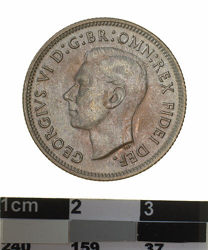 A silver coin (23.5 mm diameter with milled edge) featuring a bare head of George VI facing left; around, GEORGIVS VI D: G: BR: OMN: REX FIDEI DEF: ; below bust in small lettering the artist's initials H.P.. The reverse features a ram's head facing three-quarters left; around above, AUSTRALIA, around below between two Federation stars, SHILLING . 1952. The artist's initials, KG is in the field above the star on the right.