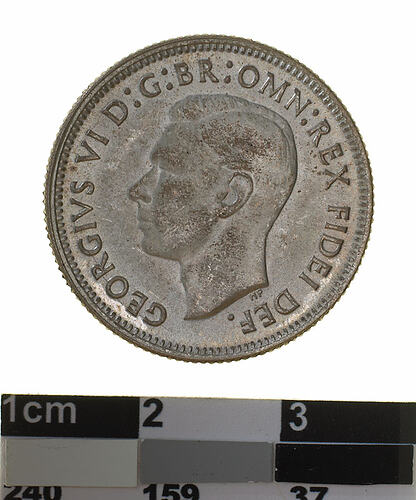 A silver coin (23.5 mm diameter with milled edge) featuring a bare head of George VI facing left; around, GEORGIVS VI D: G: BR: OMN: REX FIDEI DEF: ; below bust in small lettering the artist's initials H.P.. The reverse features a ram's head facing three-quarters left; around above, AUSTRALIA, around below between two Federation stars, SHILLING . 1952. The artist's initials, KG is in the field above the star on the right.