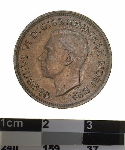 Bare head of George VI facing left; around, GEORGIVS VI D: G: BR: OMN: REX FIDEI DEF: The artis's initials H.P. in the field below the back of the neck.