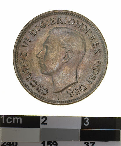 Bare head of George VI facing left; around, GEORGIVS VI D: G: BR: OMN: REX FIDEI DEF: The artis's initials H.P. in the field below the back of the neck.