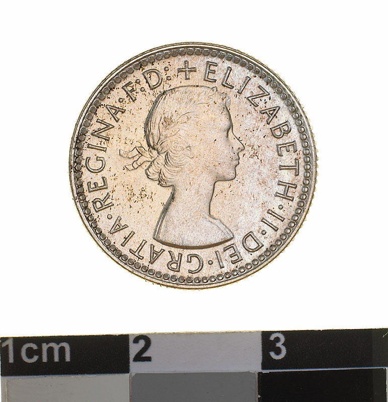 A silver coin (19 mm diameter with milled edge) featuring a laureate head of Elizabeth II facing right; around, + ELIZABETH . II . DEI . GRATIA . REGINA . F: D:. The reverse features the Ensigns Armorial of the Commonwealth of Australia, as authorised by Royal Warrent 7th May 1908 - composed of a simple shield enclosing a cross of Saint George on which are five six-pointed stars, around the outside of which are six small escutcheons, i.e., small shields. The shield is supported by a kangaroo and an emu standing on a grassy mound. Above the shield a crest, the seven-pointed star of Federation on a wreath. Below on a ribbon the motto ADVANCE AUSTRALIA is inscribed. Around above, SIXPENCE and below, between arrow heads, the date, 1955.
