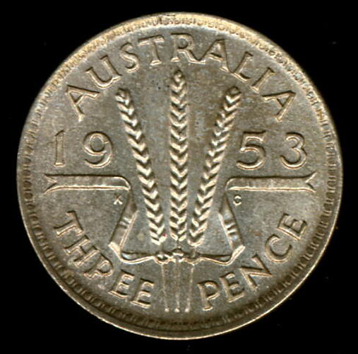 A silver coin (16 mm diameter with plain edge) featuring a laureate head of Elizabeth II facing right; around, + ELIZABETH . II . DEI . GRATIA . REGINA The artist's initials M.G. incuse on the bust truncation above the G of GRATIA. The reverse features three ears of wheat held by a curved ribbon. Around above, AUSTRALIA; around below devided into two by the stalks of the wheat, THREE PENCE, above, across the middle of the coin the date devided into two by the ears, 1953. The artist's initials tucked into the first and last folds in the ribbon K G