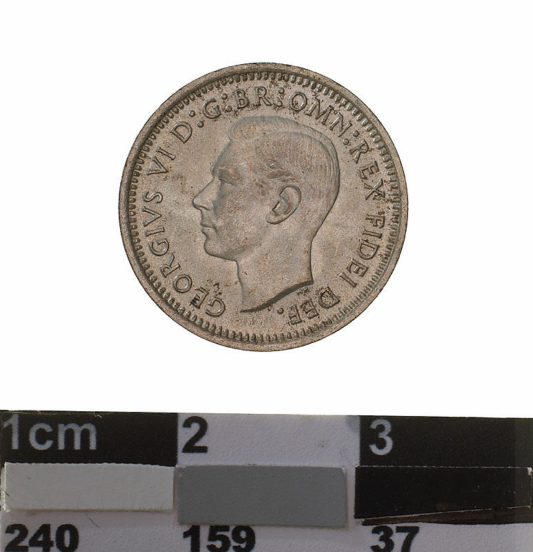 A silver coin (16 mm diameter with plain edge) featuring a bare head of George VI facing left; around, GEORGIVS VI D: G: BR: OMN: REX FIDEI DEF.; below bust in small lettering the artist's initials H.P.. The reverse features three ears of wheat held by a curved ribbon. Around above, AUSTRALIA; around below devided into two by the stalks of the wheat, THREE PENCE, above, across the middle of the coin the date devided into two by the ears, 1951. The artist's initials tucked into the first and last folds in the ribbon K G. The letters of the mint mark PL are tucked into the second and third folds in the ribbon.