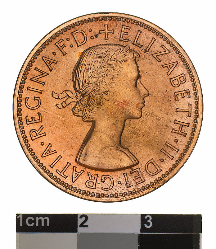 Obverse: + ELIZABETH . II . DEI . GRATIA . REGINA F: D: M.G. Reverse: AUSTRALIA PENNY KG 1955