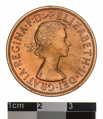 The absence of a dot after the word PENNY indicates that this coin was struck at the Melbourne Mint. On this issue reference to the Queen as defender of the faith (F:D:) was returned to the obverse legend after Australian's complained at its omission on the 1953 coinage. This was the first year since 1935 that proof coins were made available directly to collectors.
