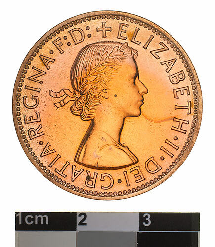 Obverse: + ELIZABETH . II . DEI . GRATIA . REGINA F: D: Reverse: AUSTRALIA PENNY. KG 1955
