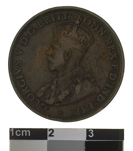 A bronze coin (30.8 mm diameter with plain edge) featuring a crowned and robed bust of George V facing left; around, GEORGIVS V D.G: BRITT: OMN: REX F.D. IND: IMP: ; below bust in small lettering the artist's initials B.M. The reverse features, within a circle of beads, the words ONE PENNY in two lines between upper and lower ornate scrolls (the mint mark I is below the lower scroll); around the circle of beads, COMMONWEALTH OF AUSTRALIA . 1917 .