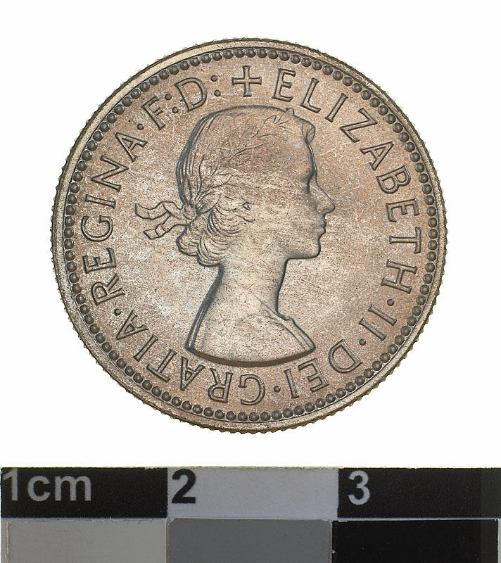 A silver coin (23.5 mm diameter with milled edge) featuring a laureate head of Elizabeth II facing right with the legend, + ELIZABETH . II . DEI . GRATIA . REGINA F: D:. The reverse features a ram's head facing three-quarters left; around above, AUSTRALIA, around below between two Federation stars, SHILLING . 1955. The artist's initials, KG is in the field above the star on the right.