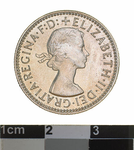 A silver coin (23.5 mm diameter with milled edge) featuring a laureate head of Elizabeth II facing right with the legend, + ELIZABETH . II . DEI . GRATIA . REGINA F: D:. The reverse features a ram's head facing three-quarters left; around above, AUSTRALIA, around below between two Federation stars, SHILLING . 1955. The artist's initials, KG is in the field above the star on the right.