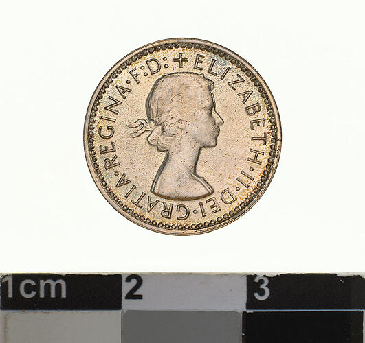 A silver coin (16 mm diameter with plain edge) featuring a laureate head of Elizabeth II facing right; around, + ELIZABETH . II . DEI . GRATIA . REGINA . F:D: The artist's initials M.G. incuse on the bust truncation above the G of GRATIA. The reverse features three ears of wheat held by a curved ribbon. Around above, AUSTRALIA; around below devided into two by the stalks of the wheat, THREE PENCE, above, across the middle of the coin the date devided into two by the ears, 1958. The artist's initials tucked into the first and last folds in the ribbon K G.