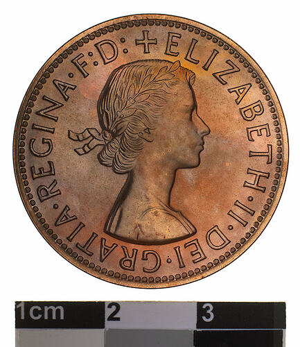 Obverse: + ELIZABETH . II . DEI . GRATIA . REGINA F: D: M.G. Reverse: AUSTRALIA PENNY KG 1956