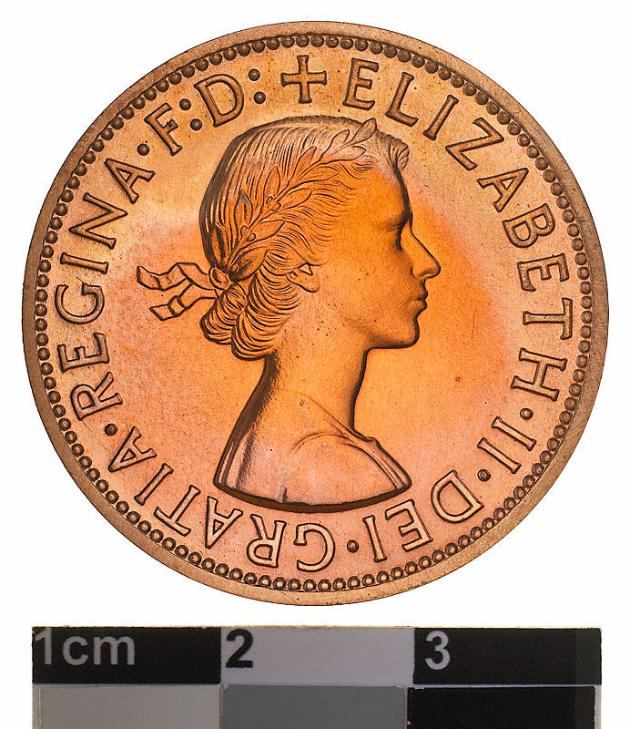 Obverse: + ELIZABETH . II . DEI . GRATIA . REGINA F: D: Reverse: AUSTRALIA PENNY. KG 1956