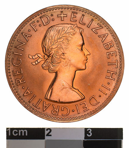 Obverse: + ELIZABETH . II . DEI . GRATIA . REGINA F: D: M.G. Reverse: AUSTRALIA PENNY. KG 1958