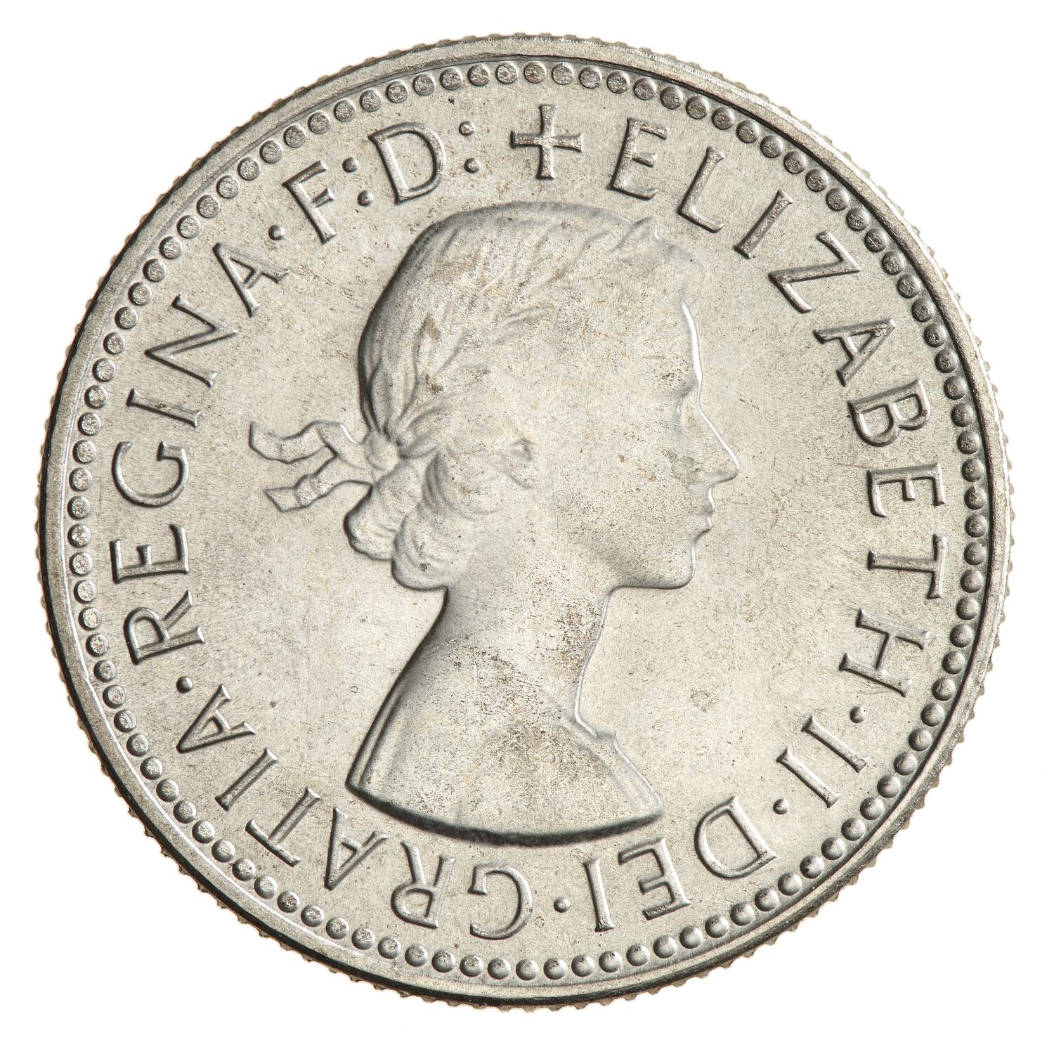 Head of Elizabeth II, laureate right; around, + ELIZABETH . II . DEI . GRATIA . REGINA . F: D: The artist's initials M.G. incuse on the bust truncation above the G of GRATIA.