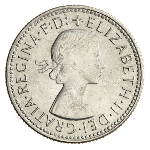 A silver coin (23.5 mm diameter with milled edge) featuring a laureate head of Elizabeth II facing right with the legend, + ELIZABETH . II . DEI . GRATIA . REGINA F: D: The artist's initials M.G. incuse on the bust truncation above the G of GRATIA. The reverse features a ram's head facing three-quarters left; around above, AUSTRALIA, around below between two Federation stars, SHILLING . 1961. The artist's initials, KG is in the field above the star on the right.