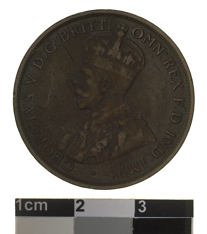 A bronze coin (30.8 mm diameter with plain edge) featuring a crowned and robed bust of George V facing left; around, GEORGIVS V D.G: BRITT: OMN: REX F.D. IND: IMP: ; below bust in small lettering the artist's initials B.M. The reverse features, within a circle of beads, the words ONE PENNY in two lines between upper and lower ornate scrolls (the mint mark H is below the lower scroll); around the circle of beads, COMMONWEALTH OF AUSTRALIA . 1915 .