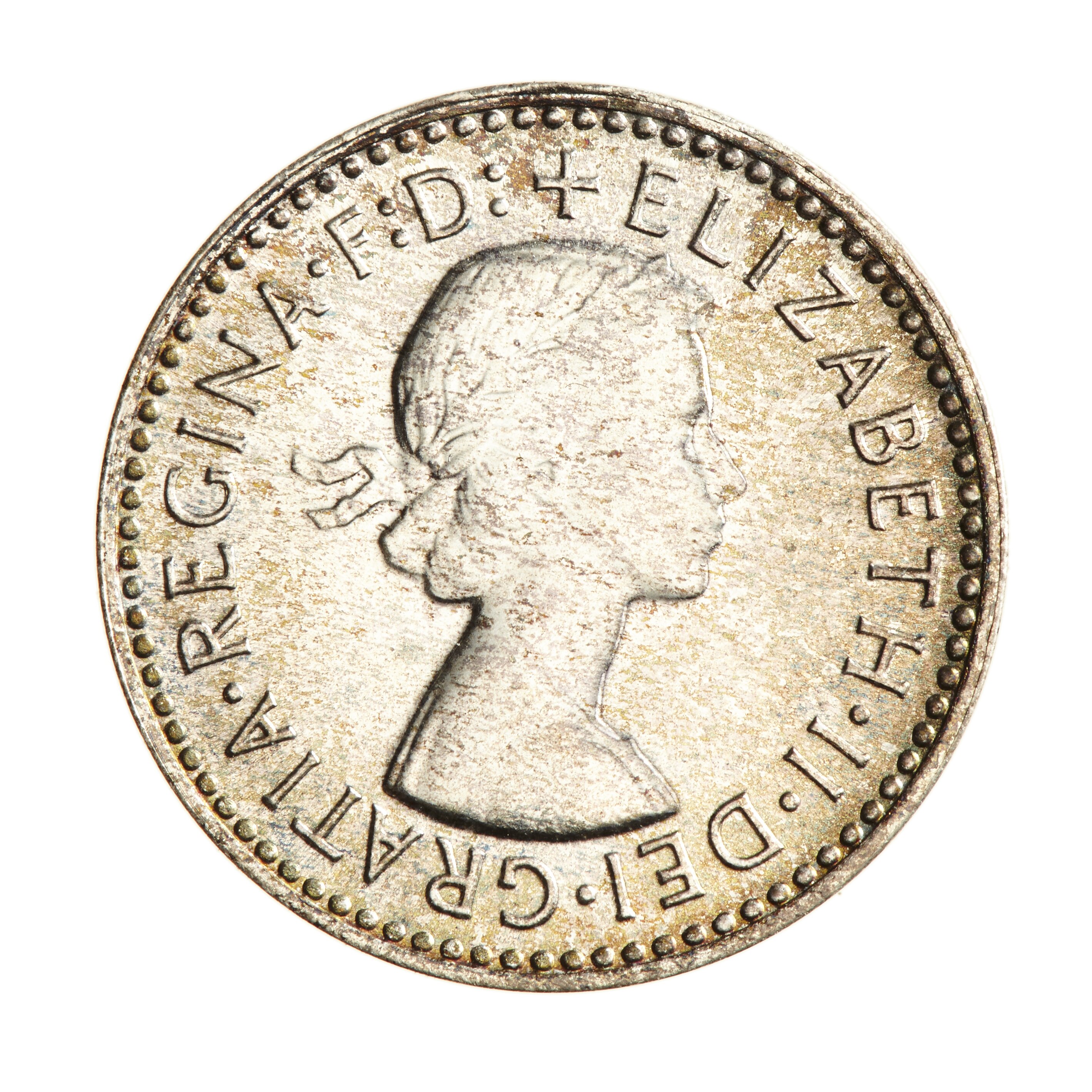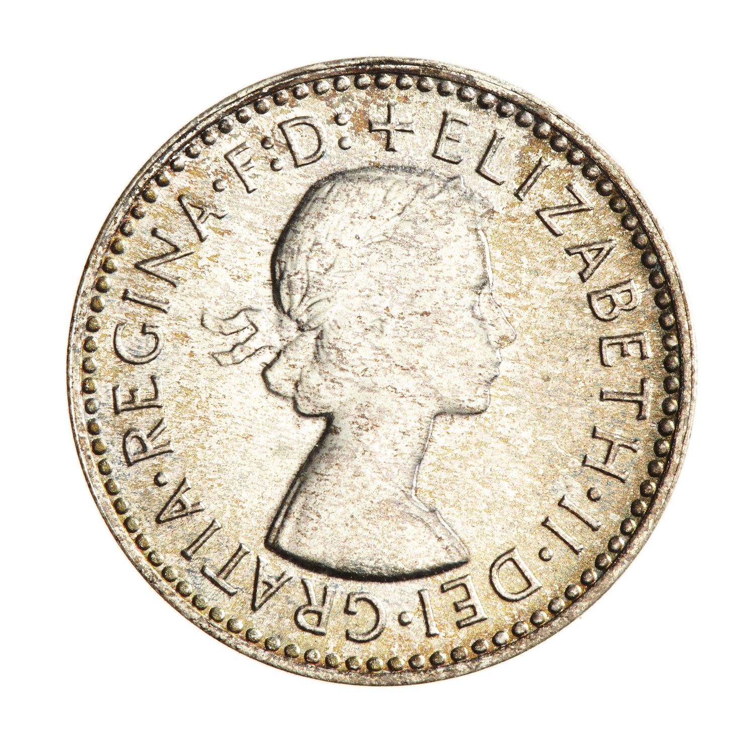 A silver coin (19 mm diameter with plain edge) featuring a laureate head of Elizabeth II facing right; around, + ELIZABETH . II . DEI . GRATIA . REGINA . F:D: The artist's initials M.G. incuse on the bust truncation above the G of GRATIA. The reverse features three ears of wheat held by a curved ribbon. Around above, AUSTRALIA; around below devided into two by the stalks of the wheat, THREE PENCE, above, across the middle of the coin the date devided into two by the ears, 1963. The artist's initials tucked into the first and last folds in the ribbon K G
