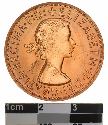 Obverse: + ELIZABETH . II . DEI . GRATIA . REGINA F: D: M.G. Reverse: AUSTRALIA PENNY. KG 1959