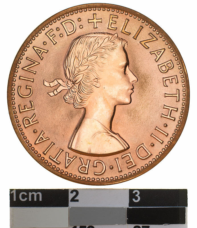 A proof bronze coin (30.8 mm diameter with plain edge) featuring a laureate head of Elizabeth II facing right; around, ELIZABETH . II . DEI . GRATIA . REGINA F: D: + The artist's initials M.G. incuse on the bust truncation above the G of GRATIA. The reverse features a kangaroo leaping to the left; around above AUSTRALIA, around below, PENNY. ; the Federation star is in the field to the left of the kangaroo and the date, 1961 is in the field below its tail. The artist's initials KG are above the tip of the tail.