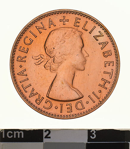 Obverse: ELIZABETH . II . DEI . GRATIA . REGINA Reverse: AUSTRALIA HALF PENNY 1955 KG
