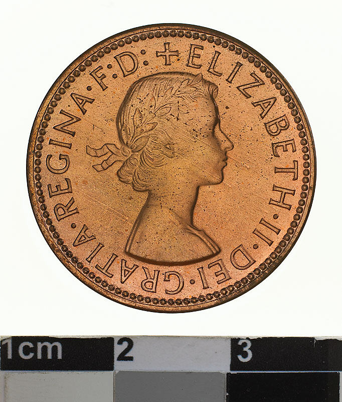 Obverse: ELIZABETH . II . DEI . GRATIA . REGINA F: D: M.G. Reverse: AUSTRALIA HALF PENNY 1959 KG