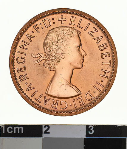 A bronze coin (25.5 mm diameter with plain edge) featuring a laureate head of Elizabeth II facing right; around, ELIZABETH.II.DEI.GRATIA.REGINA F: D: the artist's initials M.G. incuse on the bust truncation.The reverse features, a kangaroo leaping right; around above, AUSTRALIA; around below HALF PENNY. The date, 1962 is below the Kangaroo and the Federation star follows the word PENNY. The dot after the word PENNY is the mint mark.The artist's initials, KG are below the kangaroo's tail near the rim.