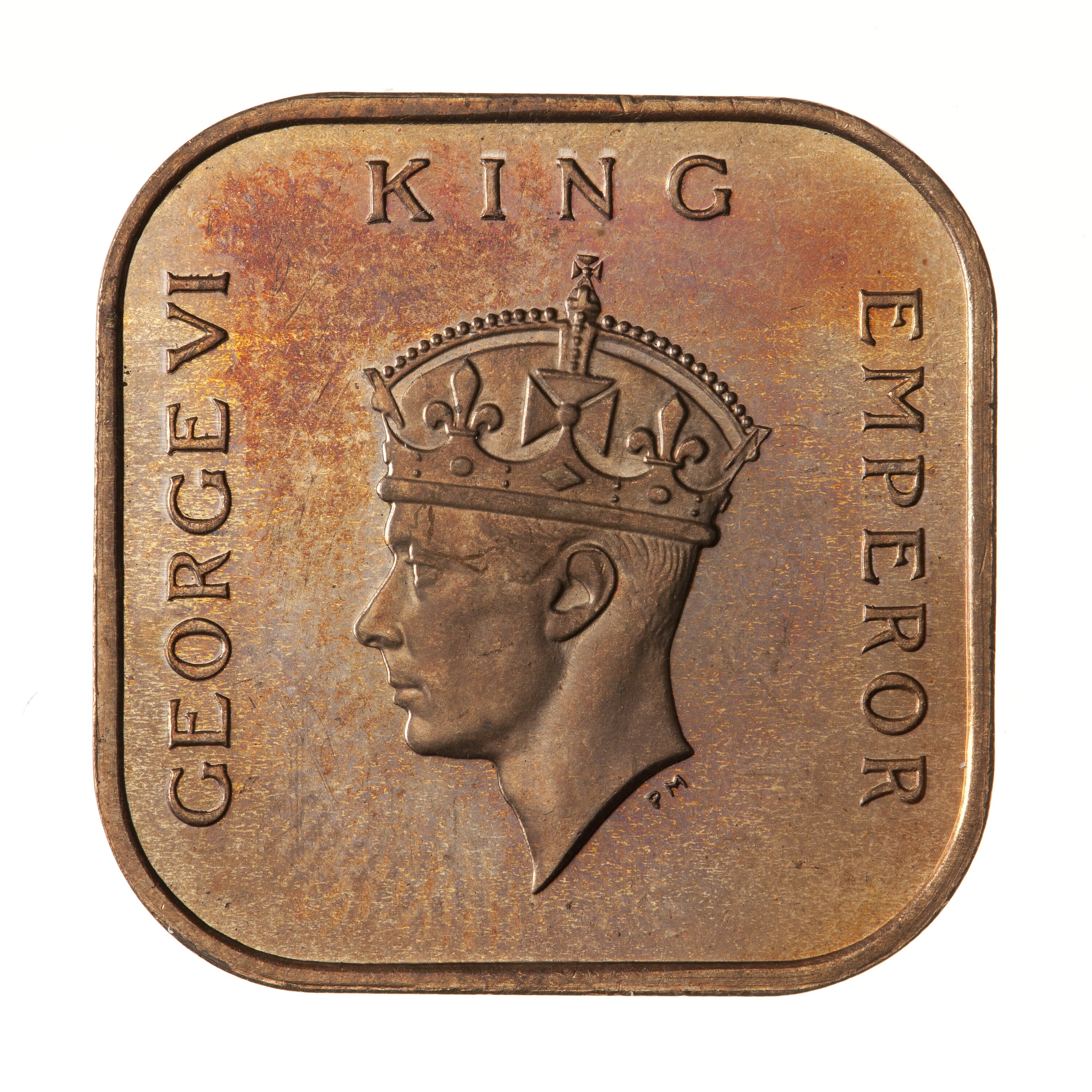 Crowned head of the King facing left; around, GEORGE VI KING EMPEROR; artist's initials, PM, below neck