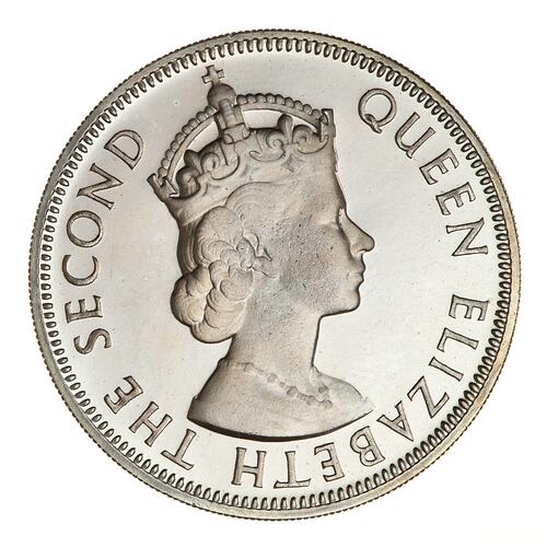 Draped and crowned bust of the Queen facing right; around, QUEEN ELIZABETH THE SECOND; artist's initials, CT, incuse on bust truncation