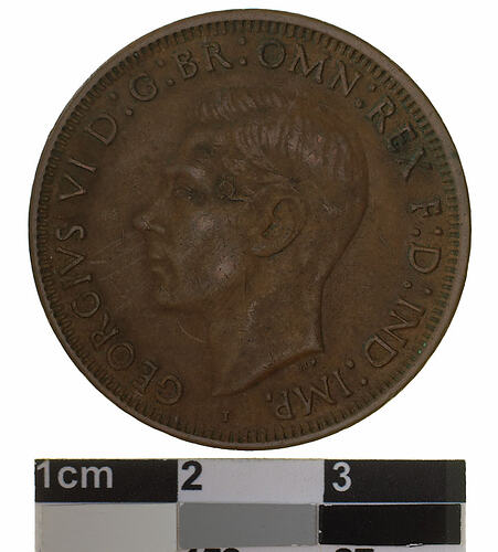 Many Australian coins were struck in India and the United States of America during World War II. The letter I below the King's head and the dots before and after PENNY on the reverse show that this coin was struck at the Calcutta mint.