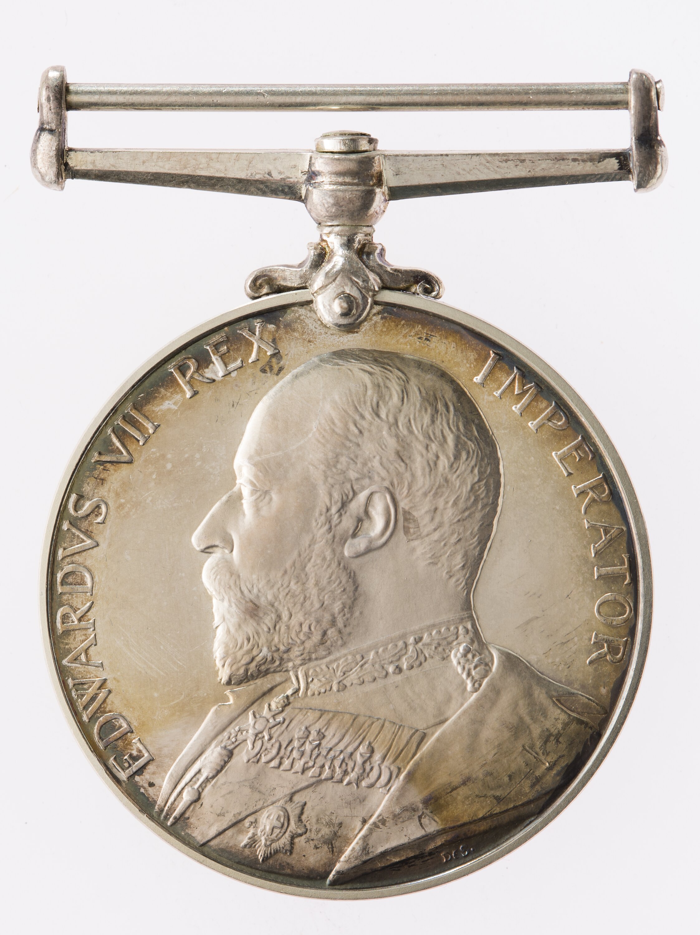 A bust of Edward VII in Field Marshal's uniform facing left; around, EDWARD VII REX IMPERATOR, the artist's initials, DES (G.W. de Saulles) is below the base of the bust.