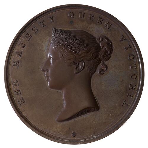 Head of Queen Victoria facing left wearing coronet, around, HER MAJESTY QUEEN VICTORIA; and in small letters on the truncation the artist's name, W. WYON R.A.