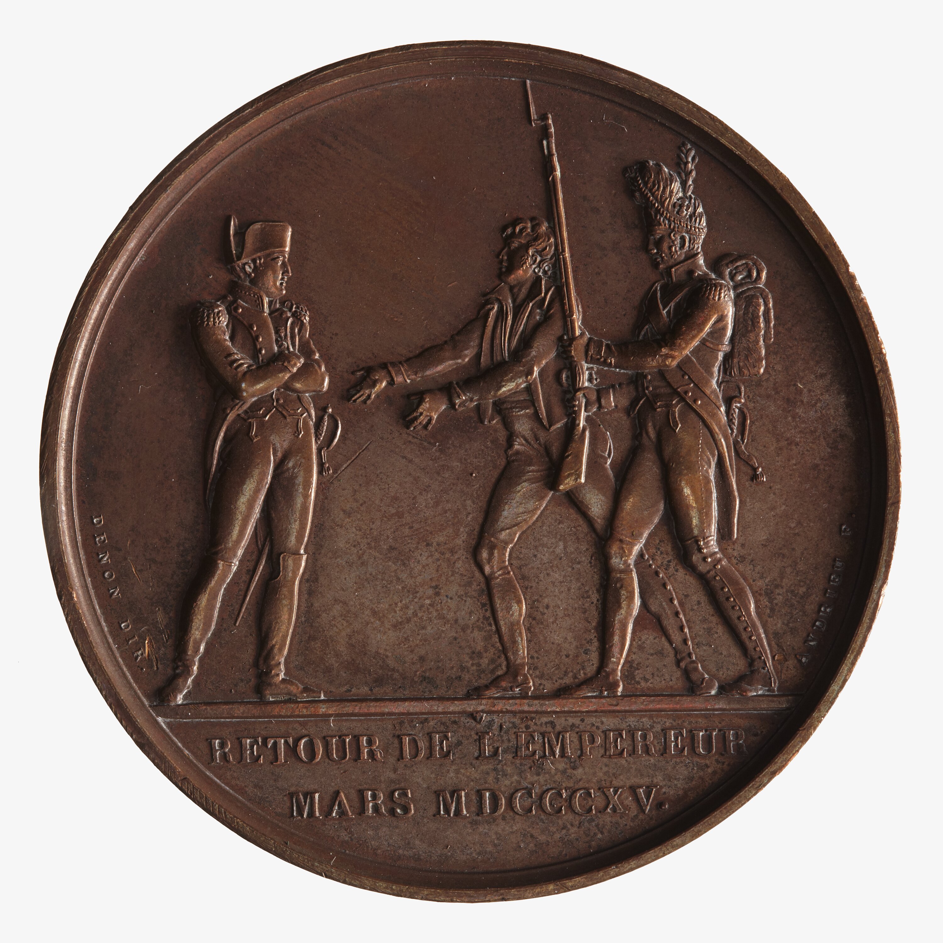 Napoleon standing left presenting himself to the people and the army represented by a soldier and a civilian who welcome him; in exergue, RETOUR DE L'EMPEROR / MARS MDCCCXV.; in small letters, DENON DIR. ANDRIEU.F