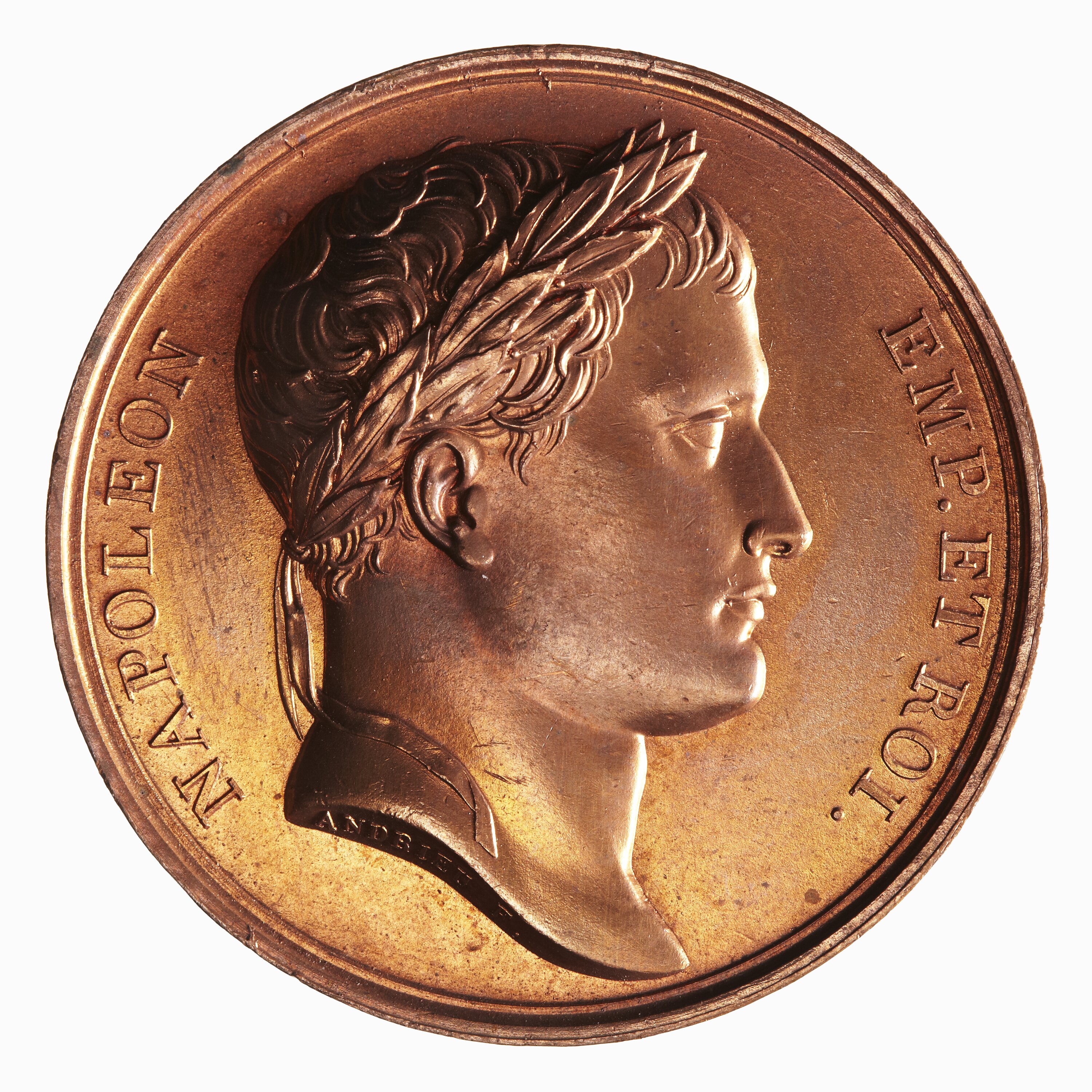 Laureate head of Napoleon facing right; around, NAPOLEON EMP ET ROI; on neck truncation in small lettering, ANDRIEU F.